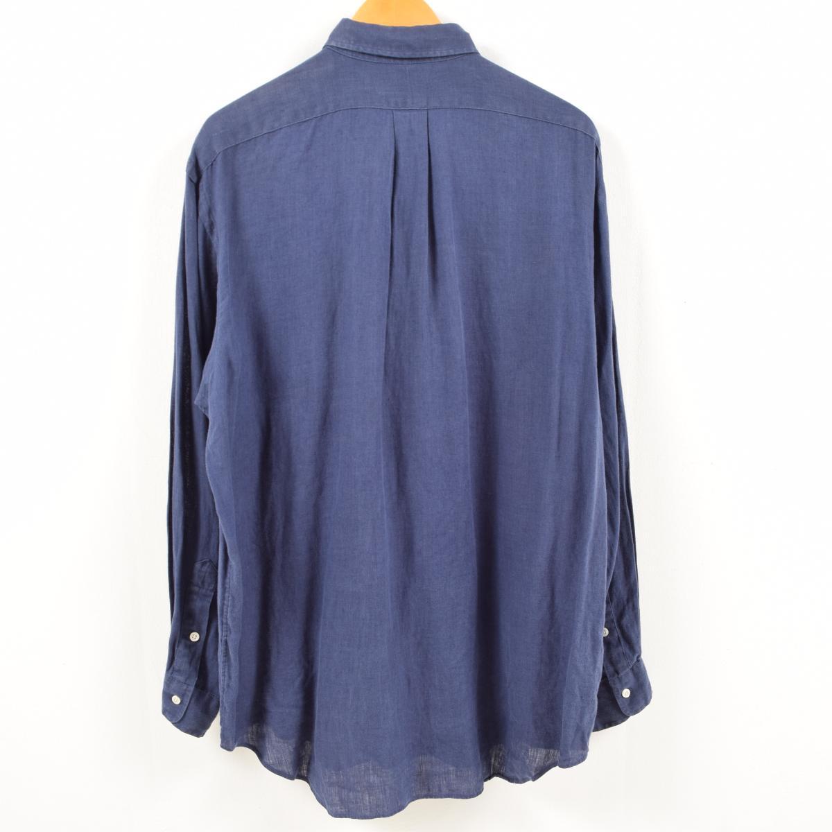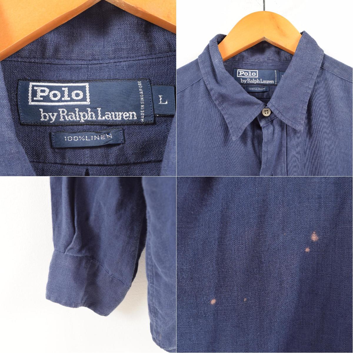 商品詳細ブランド・Ralph Lauren・ラルフローレン・特徴・ヴィンテージ・トラディショナル・カジュアル・モデル/形状・POLO by Ralph Lauren・長袖 リネンシャツ・素材・リネン:100%・色・ネイビー系 紺色・柄・無地・生産国・シンガポール製・年代・90年代・サイズ・メンズXL・表記サイズ:L・着丈:85cm・身幅:64cm・肩幅:52.5cm・袖丈:61cm・コンディション・D・カテゴリ・メンズ・長袖シャツ・その他長袖シャツ・トップス・商品番号・wax2983・取扱店・ネットショップ・スタッフコメントRalph Lauren POLO by Ralph Lauren 長袖 リネンシャツ / メンズXL / 商品番号 wax2983※写真の前面と袖の箇所に変色があります。
