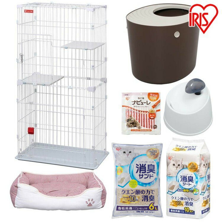 【7点セット】スリムキャットケージ2段+ねこ用ナピューレ まぐろ24本+通年用角型ペットベッドM+ウォーターディッシュ+上から猫トイレ システムタイプ+システム猫トイレ用砂 6L+システム猫トイレ用脱臭シート クエン酸入り 10枚 猫 ケージ アイリスオーヤマ
